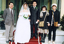 さて、挙式は、とても楽しかったぁ!のひと言です。かなりお姫様気分満喫できました。ピアノも弾くことができ良かったですよ。挙式当日は、感動するかと思っていたけど、それよりDVD撮影のカメラマンがめちゃめちゃ笑顔で、それにはまって、ず〜っと笑ってました。写真はどうですか?私としてはかなり上出来!と思っているのですが・・・。あれ?身長差があるように見えますが、実はドレスが短くて、しゃがんでいたのでした・・・。 |