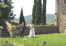 今回の旅行のメインイベントである挙式は、最高の思い出となりました!それまでの(小さな)トラブルなんて消し飛んでしまうような、素晴らしい景観の中にある小さいながらも厳格さを感じさせる教会。それもその筈、おおもとの土台は10世紀に建てられた建物(教会)だったのです。幾度となく戦災等に遭い、壊れても修復してきたそうです。そんな教会を目の当たりにした私たちは緊張し、腰が引けてしまいました・・・・(笑)。ところが、神父様は私たちを暖かく出迎えてくれ、片言の日本語で話し掛けてくれたのです。自分はヒロシマ、ナゴヤヘ行った事があるんだよ!って話してくれたのですが、よくよく聞いてみると麓の教会の神父様だったのです!なんでも日本人が来ると聞きつけてお祝いに駆けつけてくれたそうです。さすが、イタリアーノ!陽気で気さくだね〜って感心してしまいました(笑)。 |
