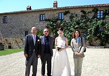 そうこうしている内に式の予行演習をする間も無く、パイプオルガンの演奏が始まりあわただしく式が始まったのです。実は、教会への到着がフィレンツェ市内の事故渋滞のため30分遅れていたのです…。遅れたのにも関わらず、神父様(今度は本当の)はにこやかに私たちを迎えてくれました。式が始まるとそんな神父様も表情が一変し、荘厳な雰囲気の中(式が)執り行われたのです。普段はヘラヘラしている新郎もこの時ばかりは緊張していました。式が終わり外へ出て参列してくださった、麓の神父様、同行してくれた現地スタッフの岡村さんと記念写真を撮ったりしていたのですが、時間は瞬く間に過ぎ後ろ髪引かれる思いでサンタ・マードレ教会を後にしたのです。ちょっと慌ただしい式ではありましたが、とても心に残る式でした。平穏無事に終わるよりも、多少トラブルがあった方が記憶に残るのかも知れませんね。 |