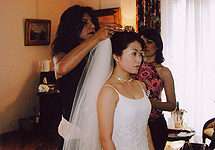 ま ずはメインイベントである、イル・パラジオ城での挙式です。当日はホテルの部屋での準備からスタート。ヘア・メイクはリハーサル無しでしかもイタリア人の方、実は少し不安に思っていたのですが、ナチュラルメイクということだけ伝えて後はお任せ。いくつか確認しながら進めて、仕上がりには大満足でした。通訳の方を挟んで、おしゃべりしながらなので緊張も無く、イタリアと日本とメイクについて意見の違いがあって驚いたりと、和やかな雰囲気でした。 |