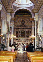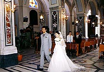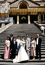 挙式は、ちょっと慌しかったですが、写真撮影でいろいろな所で撮ってもらい、気分良かったです。挙式の最中に、またハプニング・・・誓いが終わって、前の祭壇で署名をする際に、神父さんの渡してくれたボールペンのインクが、出なくなってしまい・・タドタド・・カメラさんが、胸ポケットから差し出してくれて、急遽それを借りてサインしました。挙式自体は、あっという間で、感動というよりちょっとおもしろい式になってしまいました・・・。その後、大聖堂に行って(ベンツで大聖堂の前に、到着したときはびっくり)、撮影をしました。観光客がたくさんいる中、ベンツから私たちが出てきて、みんなびっくり・・と同時に拍手喝采でした。ちょうど、小学生くらいの団体が遠足みたいで、子供たちにも祝ってもらいました。でも、これが日本だったら、かなり恥ずかしいですが、海外だとちょっと芸能人になった気分でした。 |