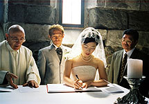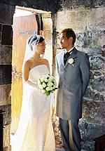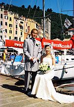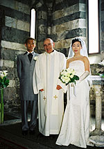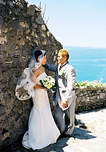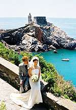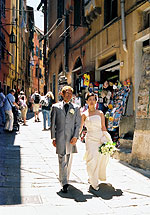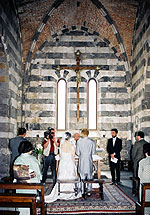 サン・ピエトロ教会での挙式の良さは、教会の建物のすばらしさ、温かい笑顔とよく響く声をお持ちの神父様、と言った、前もって分かっていた事だけでなく、地元の人や、ポルトヴェーネレを訪れるヨーロッパ人の観光客の方々から沢山のお祝いの言葉を掛けてもらえる事だと思います。みなさんに、“Auguri !” と声を掛けてもらったり、即興で挙式の様子を見てイラストを描いてくれたドイツ人の観光客がいたり、知っている人の誰もいない異国なのに多くの人に祝福され、とても感動でした。ビデオにその様子が写っているかぁ〜・・・と少し期待しましたが、私たちの様子だけ上手に編集されていたようですね。周りの様子は状況によって変わるので大変かもしれませんが、ポルトヴェーネレの場合はそのような地元の人々が一緒に映っている方が、海外挙式の良さがより伝わるのではないかな、と思いました。 |