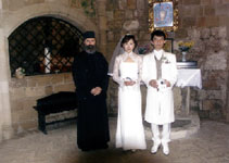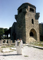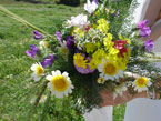 9時ホテルロビーに、ビデオ・カメラ・運転手、合計4名現地スタッフと合流し、ブーケ・ブートニアを受取、タクシーで教会へ向かいました。教会までの道のりを歩き、観光客の皆さんに祝福されながらの挙式になりました。周辺に咲いているお花で、即席ブーケを作っていただき、2種類のブーケでの撮影をしていただきました。