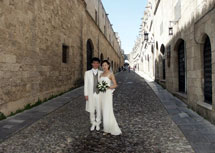 式当日の4月11日、現地気温は25度。夏日を思わせるくらいの気温でしたが、湿気は無くカラッっとしていました。前日にロドス島入りしましたが、その時は、あまり天気が良くなかったのに、当日は驚くほどの晴天!風も無く、絶好の撮影日和でした。朝食時にレストランで、現地コーディネータ キキさんと顔合せをし、ホテルの部屋で準備のお手伝いをしていただきました。メイクスタッフを依頼しなかったので、すべて自分で準備をしたのですが、キキさんに諸々アドバイスを受け、歩き方のポイントなどまで丁寧に教えていただきました。