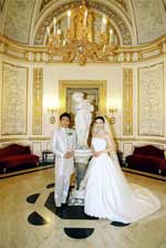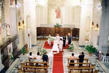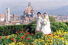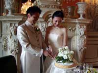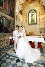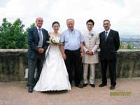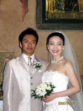 挙式が終わり、教会の外で皆さんと写真を撮ったり、妹にブーケトスをしたり…楽しいひ ウェディングランチは、ヴィラコーラで開きました。お聞きしていた通りの豪奢なホテルで、宮殿を思わせる広く美しい間でお食事をいただきました。ひさしぶりに口にしたワインで酔いが回ってしまいましたが、お料理は美味しく大変満足しました。思わず歓声をあげてしまったのが、お食事の後に運ばれてきたウェディングケーキ。用意して下さっているとは思いもしませんでした。薔薇を飾ったケーキはとても素敵で、何もかもが夢のようでした。 |