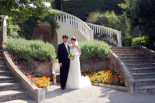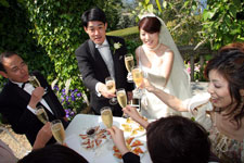 その後、ティールームのテラス席でシャンパンレセプション、そしてウェディングランチへと進みました。食事はロゼのワイン、ニース風サラダ、ビーフの赤ワイン煮込み、デザートでしたが大変おいしく量も多く食べきれないほどでした。終了予定時間の13時半を1時間も超えてしまいましたがゆっくりと挙式を堪能することができました。 |