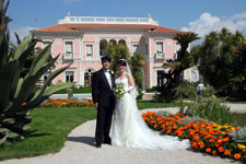 当日の4月18日はとても天気が良くとても暖かく感じました。また、4月ということもありロス・チャイルド邸はキンセンカをはじめとする黄色やオレンジ色の春の花々が咲き、また樹木の緑色や空と海の青さがとても美しい中、我々を出迎えてくれました。 |