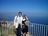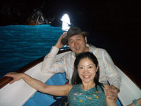 旅行は、両家の家族一緒に、ミラノ、ヴェネチア、フィレンツェ、ポルトヴェーネレ、ローマをめぐりました。家族一緒に人類の遺産とも言える芸術品や、建築物を見学し、その道中、様々な人との出会い、少々のハプニング(イタリア人女性は強かった)もありましたが、生涯の宝となる思い出となりました。 ローマで家族と別れ、二人はカプリ島へ渡りました。5日間滞在し、贅沢なリゾートを堪能しました。まぶしい太陽と青い海に囲まれ、黄色の大きなレモンが実り、色鮮やかな花々が私たちの目を楽しませ、陽気な気分にさせてくれました。パナマ帽にイタリアンブルー(?)のシャツを着て出かければ気分はイタリアン。以前はちょいと高級なパスタの銘柄だと理解していた「青の洞窟」は、小さくぽっかり口をあけ小船に乗り換えた観光客たちを待っていました。私たちもいざ出陣(?)。小船に乗り、海と岩の隙間に吸い込まれるように一気に穴の中へ。頭を上げ振り返えると、入り口から入るわずかな光が穴の中に差し込んでいました。海の底を見るとまさにそこは青い世界。吸い込まれてしまいそうな光り輝くブルーに魅せられて翌日も今度は海からのクルーズでなく陸路から洞窟へ行き、再び青い世界を体験してしまいました。そしてプライベートボートでダイビングした後、カプリ島1週クルーズなど贅沢なこともしてしまいました。 |