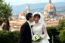挙式当日。午前中に、フィレンツェを満喫。そして、午後はフォトツアーからスタート。前日から宿泊していたヴィラコーラのロービーから撮影が始まり、いろいろな部屋でも撮影し、楽しみにしていた「ミケランジェロ広場」へと。この日は祝日で、すごい人! 車から降りた私達に、広場にいたみんなが大喝采!!