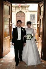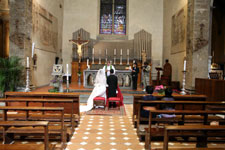 よく聞くあの「あなたは病にあっても、健やかなる時も・・・・・・・誓いますか?」のフレーズ。彼の「はい。誓います。」あの素敵な教会で、この言葉・・・やっぱり、グッとくるものがありました。感動ですよね。そしてサインするため壇上にあがり振り向くと、入り口辺りにはたくさんの人! 中に入って、見てくれていたのです! 退場し、教会を出たところで10人くらいの女性が「ブーケを投げて!」と私に言ってくれました。イタリアの地で「ブーケトス」が出来るなんて思っていなかったので、驚きましたがやっぱり嬉しい! 一リンずつ抜きブーケは返してくれました。とっても素敵な挙式でした! | ||