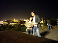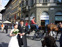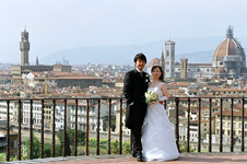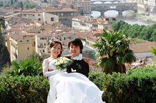 ![]() そして、もちろん挙式!!これはもう、ほんっっっとに最高でした! イタリアにいる間中、雨が降ったり止んだりの天候でしたが、式当日は暑いくらいの見事な快晴。夕方の挙式だったにもかかわらず、ミケランジェロ広場や街中での写真撮影では汗が噴き出すほどでした。 フォトツアーはヴィッラ・コーラの豪華なロビーから。あれこれとポーズを指定するカメラマンさんに踊らされる私たち。モデルのように…と言いたいところですが、ぎこちなさいっぱい。でも、とても楽しいカメラマンさんで「ニッコリ〜ニッコリ〜、moreニッコリ〜」と笑わせてくれたので、緊張することなく撮影できました。 ホテルを出て次はミケランジェロ広場へ。予想通りたくさんの人。観光中の小(中?)学生らしき団体が「アグーリ! アグーリ!」と祝ってくれたり、ほかの観光客の方にも写真をバシバシ撮られたりと普段ではありえない貴重な体験ができました。広場からの眺めは写真で見ていた以上に素晴らしく、この素敵な場所で一生の思い出に残る写真をプロのカメラマンさんに撮ってもらえるなんて!と、感激。フォトツアーでここに来ることができて良かったと実感しました。 |