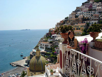 ポジターノの「レ・シレヌーセ」は、映画の中に迷い込んだみたいに雰囲気満点でした。 朝はテラスに出ると、色とりどりの街と海がキラキラ輝き、夕方から徐々にその風景は変わっていきます。 その時間になると、ホテルのバールの音楽が部屋に届いて、夜遅くまで心地いいBGMとして、私達を楽しませてくれました。 夜になると、空に大きな月が出て海に月の光が映り、街の煌きとその光がとっても幻想的です! テラスで暮れていくポジターノの風景をみていると、時間の流れが全く違って感じられ、とっても贅沢なひとときでした。 |