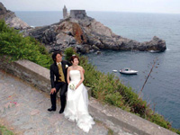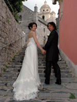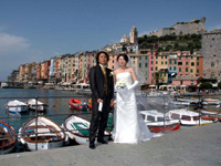 挙式の当日、晴天の中ホテルから教会までフォトツアーをしながらの移動。ポルトヴェーネレの色とりどりな街並みと、すれ違う観光客や海水浴客から「アウグーリ」のお祝いの言葉に感激。しかし緊張と恥ずかしさで一杯でした。