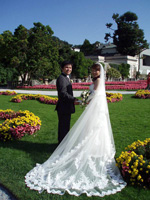 挙式が終わり、いよいよ庭園での写真撮影。ザルツブルグに来てこの庭園を訪れない観光客はいなく、ましてや今年はモーツァルトyear。私達が外に出たとたん、世界中から訪れている観光客のシャッター音がいっきに聞こえました。しかし私達は典型的な「恥ずかしがりやの日本人」。こんな多くの様々な国の方々から一気に注目を浴びる経験など当然初めての私達は、始めはテレながらも、カメラマンの上手な魔法で、いつの間にかすっかりザルツブルグのスター気分に(笑)。