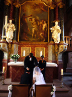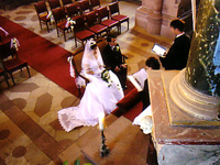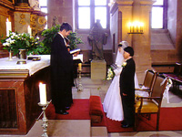 楽しいお話をたくさんして下さいました。そのおかげで私は緊張感が和らぎ、リラックスした気持ちで出発時間まで過ごすことが出来ました。 ドレスを着終えた頃、ベッカーさんが白いバラのブーケを持って迎えに来て下さいました。 ロールスロイスでお城へ到着すると、観光客がたくさんいました。車から降りると一斉に注目を浴び、何枚も写真を撮られ「おめでとうございます。」と声を掛けて下さる日本人の方もいらっしゃいました。 チャペルでの挙式は感動的でした。パイプオルガンの趣のある音色と、牧師さんの美しいドイツ語の響きが印象的で心地よかったです。挙式の合間のオルガン演奏は、 音楽が好きな私たちのために、特別に長くして下さっていたのだそうです。また、牧師さんのお話は、挙式を行うふたりに合わせ、毎回違った内容で行うそうなのですが、最後に朗読していただいたカリルギブランの詩が、私たちの理想とする夫婦のあり方をあらわしていたため、とても感激しました。 その詩は、記念にいただいたカードにも記されていたため、今でも時々読み返しています。 挙式において、お世話をして下さった方おひとりおひとりの心の温かさに触れ、歴史を感じさせるパイプオルガンの調べに導かれながら、神の祝福を受けたことにより、お互いに今後の人生のパートナーとして尊敬の気持ちで接し、歩みを揃えながら前に進んで行こうという気持ちになりました。挙式の後、テラスに出て牧師さんとベッカーさんと私たちの4人で乾杯し、楽しくお話をさせていただいたことも美しい思い出となりました。 |