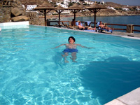 | 昼間はホテルのプライベートプールとビーチとの往復。ほんとに久しぶりに何もしないで過ごしました。挙式当日も2時間前までビーチにいて、とても結婚式をやるという気がしないほどのんびりとした時間を過ごしていました。夜になるとミコノスタウンへ繰り出し、迷路の街並みを堪能。小径好き&雑貨好きの奥様にはたまらなかったようです。食事は海の幸を堪能。ドイツでは味わえない新鮮さに感動。また夜中12時過ぎでバスを乗り間違えて迷子になってしまい、親切な方に助けていただいたこともありました。今思い出しても本当にいいトコロで挙式をしたと、いい気分になれます。 | |||||
