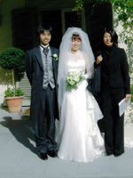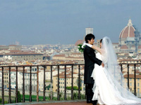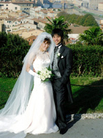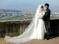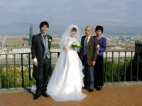 挙式当日は、前日までの寒さと打って変わり、非常に暖かく、晴天に恵まれることが出来ました(自称!!晴れ男なもので!)。 朝、現地のヘアメイク(男性)さんと、メイク(女性)さんにより、満足のいくメイクが完成しました。写真撮影も現地のカメラマンさんの要求で、どんどんポーズもエスカレートしていきました(笑)。なぜかうちの父親もエスカレート!(謎) その後ミケランジェロ広場で写真撮影後、サンタマリア教会へ。昨日までのラフなカッコの神父さんとはことなりまさに聖職者といった面持ち、緊張も一挙に跳ね上がりました。式は私自身非常に長く感じました。もちろん、指輪を右手にはめようとしたり、誓いの言葉を間違えたり、よくみる一通りのハプニングもすませ、式も終了しました。 いろいろハプニングはありましたが、感無量でした。ちなみに奥様は神父様の歌(アレルヤ)でウルウル!