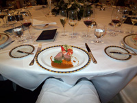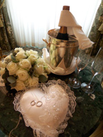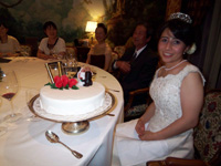 フォトツアー終了後、ホテルに戻り一旦外出して部屋に帰ってみると、グランドホテルスタッフからのカードを添えた冷えたシャンパンとアルバムが置いてありました。アルバムは先ほど帰ってきたばかりのフォトツアーでの写真が並んでいました。すぐにアルバムが見られたのは嬉しかったです。 夕食はグランドホテルの最上階のレストラン、ル・シエル (Le Ciel)でご列席の方々とささやかなウェディングディナーを行いました。もちろんコーディネートは藤本さんにお願いをしていました。夕食時も新郎新婦はウェディングスタイル!新婦はベールの代わりに可愛らしいティアラをつけて(これはウェディングプレッジの田中さんのアドバイス)。ちょっとしたお色直しの気分を味わえました。ディナーは私たちのための日付が入った特別なウェディングディナーメニューが用意されていて感激しました。最初から感激の連続で、もちろん料理は目で楽しんだ後は舌で十分に楽しみました。白いザッハトルテ風のウェディングケーキでケーキカットも行いました。 |