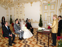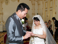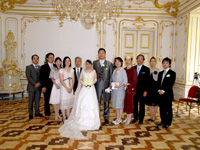 | 山田さんの観光地の説明を聞きながら向かっている車外では、道端から手を振ってくれる人やかけ声をかけてくれる人がいました。私たちも今日ばかりは主役ですから調子に乗って振り返しました。気分も十二分に盛り上がった頃に宮殿に到着しました。意外だったのは私たちも、参列者も、一般の観光客と同じゲートから入った事!さらに驚いたのはゲートの脇には結婚式の告知が貼られていて、自分たちの名前がそこに記されていました。そこからは観光客に写真を撮られ、声をかけられながらの道のりでした。山田さんの説明を聞きながら、あのマリーアントワネットが遊んでいた未公開の部屋を通り抜け、挙式の間の前室で一休み。ちなみに、挙式の間はあのシシーの私室で、金色の縁取りと白い壁がとても綺麗な間でした。家族や友人と写真を撮った後にいざ!本番へ。 | |||||||||||