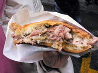 ランプレドット(牛の第4胃)のパニーノ:フィレンツェにて。屋台に群がるお兄さん達の後ろから、大声で注文してゲットです!軟らかく煮込んだプルプルのモツに、イタリアンパセリのソースとすっぱくて辛いタレがかかっておいしかったです。(※ちなみにトリッパは牛の第2胃)