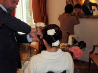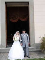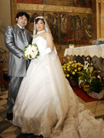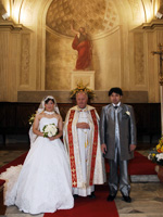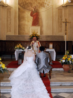 そして車で40分、サンタ・マリア教会へ。イタリアには挙式のリハーサルという概念はなく、講座後、気がついたら式が始まっていました。『間違ったとしてもそれもよい思い出』ということらしいのですが、確かによく考えれば、ヴァージンロードって、初めて歩くからヴァージンロードなのですよね。パイプオルガンの音色、神父様のイタリア語によるブレッシングにはとても感動させられました。とっても格式の高い教会での挙式を肌で感じることができ、ヴァージンロードを歩いている時、なぜか自然に涙がでそうになりぐっと堪えました。(恥ずかしいので秘密にしてましたけど・・笑)挙式後はホテルに戻り、ウェディングランチをいただきました。かわいいケーキもあってアットホームな感じで良かったです。 |