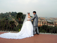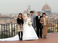 10月27日 挙式当日 わざわざお祝いFAXありがとうございました。嬉しかったです!ホテルの自室でヘアセットメイク開始。普通な感じで!とオーダーしましたが、イタリアは普通の基準が激しいので、外国風にしっかり出来上がっちゃいました(笑)でも嫌いじゃないです(笑)途中、ミケランジェロ広場にて写真撮影をしましたが、観光客の方々に「Congratulations!」と言ってもらったり、なぜかめちゃくちゃ写真を撮られたりと結構その気にさせられました。現地の方々、ありがとうございました!!少し曇っていたのですが、写真を撮り始めたとたんパーッ!!と光が差してお天気になりました。なんかちょっと感動してしまいました。。。 |