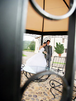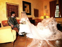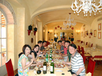 などの有名ワインの数々やオリーブなど世界的に知られる農産物、バランスのとれた郷土料理だと山田さんから聞いていましたが、本当に日本人の口にもあい、非常においしかったです。昼食の後、妻は2時間ほどブッダスパに出かけました。ホテル内にあるブッダスパへは広大な敷地であるために車での移動となります。スパでのボディ&フェイシャルエステは、さすが5つ星ホテルといわれるだけあり、非常に豪華でありゆったりでき、お肌もピカピカ(?)で翌日の挙式に備えられたようです。夕方には心配していた天候も好転し、広大な敷地を散策した後ドレスアップし、前夜祭。トスカーナ料理を味わいながら楽しく過しました。 |