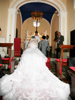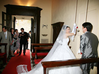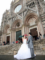 さぁ、挙式本番。ホテルの中にあるサンティ・ヴィンチェンツォ教会で行いました。家族に見守られながらイタリア語で行われる式は、温かで心地よい緊張感と特別感を味わいました。教会も「ホンモノ」という風格があり二人の挙式を一層盛り上げてくれました。短時間の打ち合わせでしたが滞りなく式は進行し鐘を鳴らして終了。神父様との記念撮影の後、両家家族みんなでシエナの町へフォトツアーに出かけました。 |