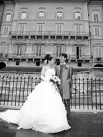 シエナは、装飾性と気品と落ち着きが調和した古都で街全体が世界遺産というのもうなずけるほど美しく、フォトツアーでは街のシンボルである、ドゥオモ(大聖堂)と、雰囲気、デザインともにシエナの顔である、カンポ広場で写真をとりました。ここでとった写真はどれも荘厳な雰囲気が出ており、とても気に入っています。フォトツアーでは、広場が広かったため周りのたくさんの観光客に写真を撮られたり、手を振ってもらったりと多くの方に祝ってもらった気分で印象深かったです。また、移動の際は家族だけでなく、カメラマンの方にもドレスの裾を持ってもらったり傘を差してもらったり特別にシャッターシーンを増やしてもらったりと、みなさんに協力してもらえたことにたいへん感動しその感謝の気持ちをずっと忘れないと心に刻みました。 |