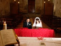 お薦めいただいた『サン・ロレンツォ教会』は、小さいながらも歴史を感じさせるすばらしい教会でした。ただ、実際は緊張のため建物の内部は、よく見ることができなかったのですが〜。写真を見てこの教会に決めたときは、二人で「天井が高くていい感じだね〜。どうなってるかよく見てこようね」なんて言ってはいたものの、挙式後ホテルへ帰って落ち着いたとき「あ〜すっかり見るの忘れてたね;;;」なんてことになりました^^ 後で写真を見て「こんな素敵なところだったんだね〜」と二人揃ってニンマリしていました。 |