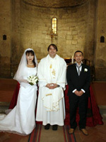神父様はとても温かそうな方で、緊張もいくらかほぐれました。神父様が聖書を読まれているとき、じわっと感動がこみ上げてきて・・・緊張の中にも温もりのある感動的な式でした。(こんなことを言っては大変失礼かと思いますが、神父様、彦○○に似ていらっしゃいました・・・ククク) |