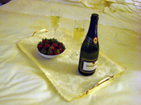 私の両親と主人の両親、そして私達夫婦の総勢6名で日本を出発し、フィレンツェへと旅立ちました。機内では、ハネムーン用の機内食が出てきました!ホテル<グランド・ミネルヴァ>では、部屋にはシャンパンといちごのプレゼントが置いてあり、感激!!早速、乾杯しました。 |