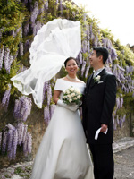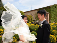 いよいよ挙式当日!心配していた雨も上がり、雲の間から晴れ間がのぞく天気となりました。ラッキー!!!朝、通訳の米山さんとイタリア人美容師の方が二人、部屋に来てくださいました。私はメークとヘアスタイルの写真の切り抜きを持参していたので、米山さんに、その切抜きとともに私の希望するイメージを美容師さんらに伝えてもらいました。二人ともすぐに理解してくれ、非常にてきぱきとした対応で、あっという間に仕上げてくださいました。思ったとおりの仕上がりで、大変満足することができました。挙式の前に、ボルゴ・ラ・バーニャイアの敷地内のフォト・スポットで、家族を交えて写真撮影を行いました。この日は風がびゅんびゅん吹いていて、風を使った素敵な写真を撮ってもらいました。 |