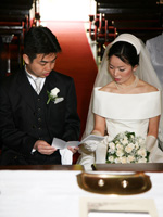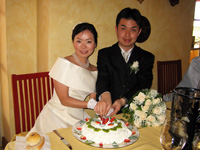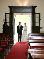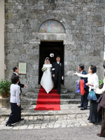 いよいよ、サンティ・ヴィンチェンツォ教会でのブレッシング挙式です。こじんまりとしたかわいらしい教会でした。父親の希望により、父親と一緒にバージンロードを歩きました。ちょっと照れくさかったけれど、思わずじんときてしまいました。誓いの言葉を言うときには、本当に結婚したんだという実感が伴ってきて、夫とともに温かい家庭を築いていこうという思いをより強くました。教会を退場するときには、家族にライスシャワーでお祝いしてもらい、嬉しかったです。 |
