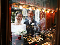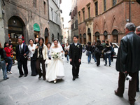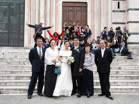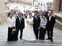 挙式の後は、シエナでのフォトツアーに出発しました。行く先々で女の子達から「おめでとう!」と言ってもらい、嬉しかったです。教会の前では、階段に座っていた人達が拍手とともに「おめでとう!」と口々に言ってくださって、思わず目がうるうるしてしまいました。あれは本当に嬉しかった!!!その上、カメラマンさんの計らいで階段の皆さんと一緒に素敵な写真を撮ってもらうことができ、本当に一生の思い出となりました。 |