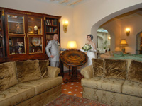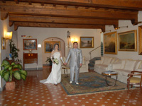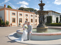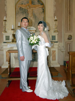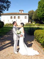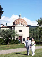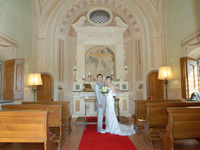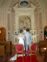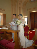 2009年5月5日、私たちはイタリア・フィレンツェ郊外のサン・ヴェルディ教会にて挙式しました。当日は、16時からの挙式ですが、お昼頃に、ちんたら路線バスに乗って現地へ向かいました。15時よりちょっと前に、コーディネータ(通訳)の方が到着し、挙式の流れや誓い言葉の説明を受け、いざ挙式へ!!まず、カメラマンにホテル内や広い敷地内の芝生などで、でさまざまなポーズを促され、照れながらも楽しく写真撮影してくれました。撮影も終わり、教会へ。 |