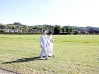 挙式が終わり、ホテルへ帰るときに、敷地の周りは住宅地になっているところもあるので、歩いている私たちに二階のベランダからおばちゃんが「おめでとぉ〜〜!!」と手を振ってくれたり、イタリア人の温かみも感じることができました。平日だったせいもあるのかホテル利用者は少なく、私たちはドレス&タキシードと普段ではあり得ないカッコをも少し楽しみたいと思い、敷地内をもう一度散歩し、その時間を楽しみました。 |