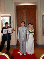 扉が開き、チャチャチャチャ〜ンとヴァイオリンの音色が教会の中に響きわたりました。私たちは、親族も呼ばず二人きりで行いました。感動はなく、楽しく終わるだろね〜なんて話していたのですが、そのヴァイオリンの音を聞いたら、感動しました!!!
