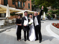 挙式後のランチパーティーも、大盛況!普段あまりイタリア料理を食べる機会の無い父も、美味しい美味しいと大喜び。ワインが相当進み、最後は隣のグループのイタリア人の男性と「カンパーイ!」と杯を交わし合っていました。。。とにかく、海外旅行に慣れていない私の両親も存分に楽しめた様で一安心でした。 |