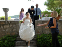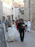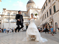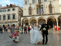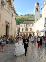 挙式中はもうなにがなんだかで、促されるままに椅子に座ったり、宣誓の言葉や誓いのキスを粛々とこなし、指示されるままにポーズを決めて何百枚という写真を撮られます。ドレスとタキシードそのままの姿で世界遺産の街に繰り出してみれば、数百年の時を刻む鐘の音に迎えられながら観光客たちの祝福の眼差しの中で、石畳の回廊を踏みしめます。何百の国々からきた何百の人々から思い思いに祝いの言葉を受けたり握手を求められ、ラピュタの古都にでも紛れ込んだかのような路地の先はこのまま現代から遠ざかってしまうんじゃないかと思える茫洋とした海と夕日が広がっています。朝日と夕焼けがいっぺんに出てきたような騒動のなかで、ドブロブニク特有の絢爛と静謐の狭間にもまれながら、式は終わりを告げます。 |