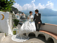 少し式の段取りを確認した後、アマルフィの町中にフォトツアーに出かけました。いろいろなところを歩きましたがすれ違う人みんなに「アグーリ!(おめでとう)」と声を掛けて頂いて、とっても嬉しかったです。50回位はグラッツェって言ったような気が・・・。イタリア人は陽気でお祝い好きと聞きましたが本当にその通りでした!知らない人にもたくさん写真を撮られて何だかその日は芸能人にでもなった気分でした!!でもお姫様気分を味わえるのはこんな時くらいなので存分に楽しんじゃいました。 |
