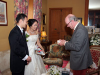 お部屋で朝食を取った後、メイクさんとヘアメイクさんが部屋にやってきました。どちらもフランス人だけれども、日本人に合うメイクを研究されているだけあって、自然な仕上がり。身支度を整えたら、2人でチャペルへと向かいます。部屋を出たところからカメラマンさんがスタンバイ。廊下を歩くところから写真を撮ってくれます。今回、2人だけで式を挙げる予定だった私たち。ありがたいことに宿泊客の方々が参列し、私たちの門出を見届けてくれることになりました。伯爵が執り仕切ってくれ、厳かに挙式は終了。2人だけなのであきらめていたフラワーシャワーも参列してくれた方々のおかげで実現できました。 |