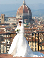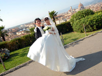 そして今回のメインとなるフィレンツェでの挙式当日、天気も私達の願いが通じたのか見事に快晴!ホテルに山田さんからのお祝いのFAXが届いていました(どうもありがとうございました)。アシスタントの中本さんと午前中にヴェッキオ宮殿にて書類手続きを済ませ、昼食後いよいよ準備が始まりました。ホテル・ミケランジェロ広場・ヴェッキオ橋付近での写真・ビデオ撮影は初めての体験なので、慣れない二人は最初、顔が引きつっていましたが、段々と笑顔が出てきて良い表情ができるようになりました。 |