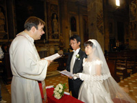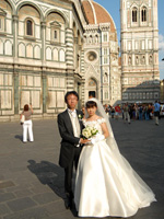 写真・ビデオ撮影を行いながらサンタ・レーナ教会へ移動し、16時30分ついに挙式が始まりました。サンタ・レーナ教会はフィレンツェの市街地にありますが、歴史を感じさせる教会で、私達はこのような教会で式を挙げることができ、幸せ者だと思いました。街中をタキシードとウェディングドレスで歩くのは恥ずかしかったですが、「おめでとう!」と声を掛けてもらったり、私達の姿を写真で撮っている人を見たら、一生に一度、今日だけドラマの主人公になったような気分でした。日本に帰って来た今でも当時の感動の様子が思い出されます(実は感動が覚めず、翌日も二人で教会を訪れて余韻に浸ってしまいました・・・)。 |