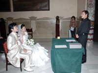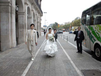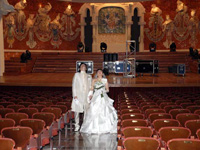 朝7:30から日本人ヘアメイクさんがアパートメントまで来てくださり、妻の支度開始。少し後で日本語ガイドさんと現地カメラマンも合流。若干支度が押してしまったようで、多少バタバタしつつもカタルーニャ音楽堂へ。写真でしか見た事のなかったカタルーニャ音楽堂の階段を上り、親族やセレモニーマスターが待つホールへ向かいました。 |