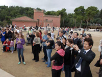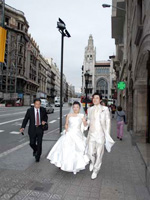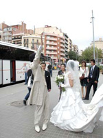 セレモニーはステンドグラスが随所に配されたとても美しいホールで感動の中無事終了。スペインのカヴァ(スパークリングワイン)で乾杯と共にケーキカットを済ませました。その後は大ホールに移動し、夢のように大きなステンドグラスに感激したりしつつ写真撮影を行ったりしながら、後ろ髪を思いっきり引かれつつ、カタルーニャ音楽堂を後にし、バルセロナ市内のフォトツアーへ。 |