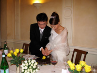 式は真っ白の壁に囲まれた空間で行われたのでとても厳粛な気分になりましたし、バイオリンの伸びやかな音がサロン中に反響して胸の奥まで響いてくるような感覚を覚え感動的でした。家族と友人が見守る中、父と腕を組んで祭壇まで歩けたこと、緊張して指輪を右手にはめてしまいそうになったこと、カトリックの流儀に従い控えると聞いていた誓いのキスを神父様に笑顔ですすめられたこと、全てがキラキラした大切な思い出です。 |