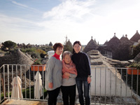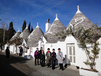 その後、アルベロベッロへ。トゥルッロと呼ばれる伝統的なとんがりお屋根の住居群。なんと宿泊はそのトゥルッロ!1軒がまるまる私達のホテルでした。しかも200〜300年前に建てられ実際に住居として使用されていたものをつい最近改装してホテルにしたそのトゥルッロの広さと快適さんにみんなも大満足でした。 |