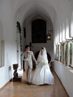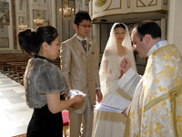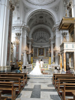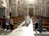 その後、ホテル内でのフォトツアー後、いよいよ教会のあるミノーリへ。外観は白と黄色で彩られたとてもかわいい教会でしたが、中に入ると高い天井、奥行きのある空間、白を基調に金細工の装飾が施され、デコレーションされた柱、壁、天井。まさに荘厳な教会がそこにはありました。パイプオルガンの神聖な音が響く中を歩いたとき思わず、涙がこぼれました。絶対に日本では味わえないと実感しました。本場カトリックの様式に則ったすばらしい挙式でした。 |