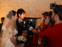 参列席にはたくさんの町の人、美人な市長さんと市役所のスタッフの方々。そして祭壇には俳優のようなイケメンの司祭さん。そしてここでも祭壇をぐるりと取り囲んでカメラとレポーターが!通訳さんを通して誓いの言葉を交わし、指輪を交換した後に誓いのキス。カメラに取り囲まれながらのちょっとぎこちないキスでしたが、参列席からは大歓声が。 |